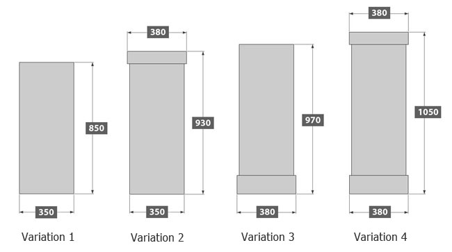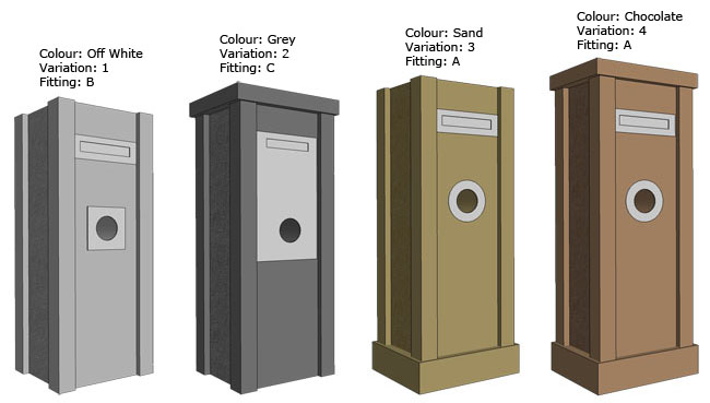 Combinations of four colours, four variations of square caps/bases and three options of stainless steel fittings are available. Dimensions of all letter boxes are identical, and shown below.
