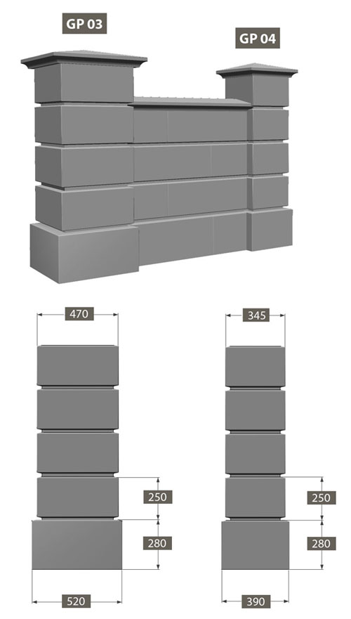 Two sizes of block piers available, GP 03 fits double brick wall and GP 04 fits single brick wall.