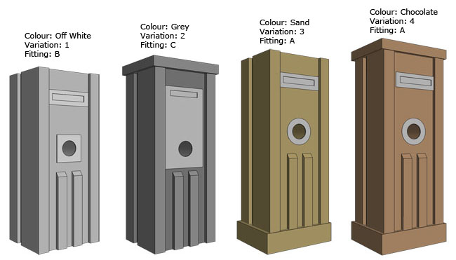 Combinations of four colours, four variations of square caps/bases and three options of stainless steel fittings are available. Dimensions of all letter boxes are identical, and shown below.